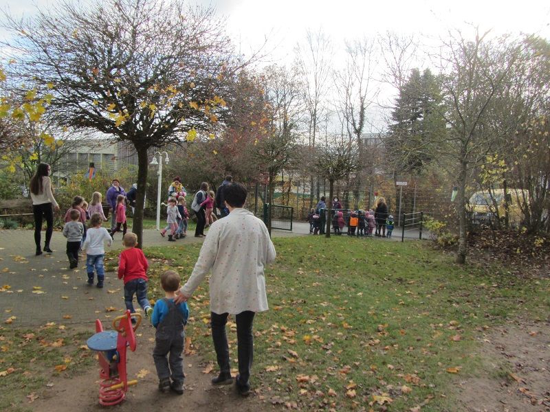 Die Mäusekinder waren gefesselt von dem Martinsschauspiel, welches ihnen ihre Érzieherinnen zur Überraschung vorspielten. Nach dem symbolischen Teilen (Tellertausch) der Brezel beim gemütlichen Zusammensein zogen sie singend mit den leuchtenden Laternen los.