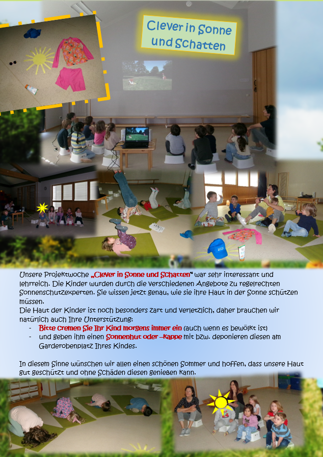 Hierbei erfahren die Kinder auf spielerische Art die richtigen Verhaltensweisen zum Sonnenschutz. Dabei werden sie zu Schatten-Detektiven, zu Experten für Sonnenkleidung, singen „ Das Lied vom Sonnenschutz“ und spielen „Das Fingerspiel im Sonnenschein“